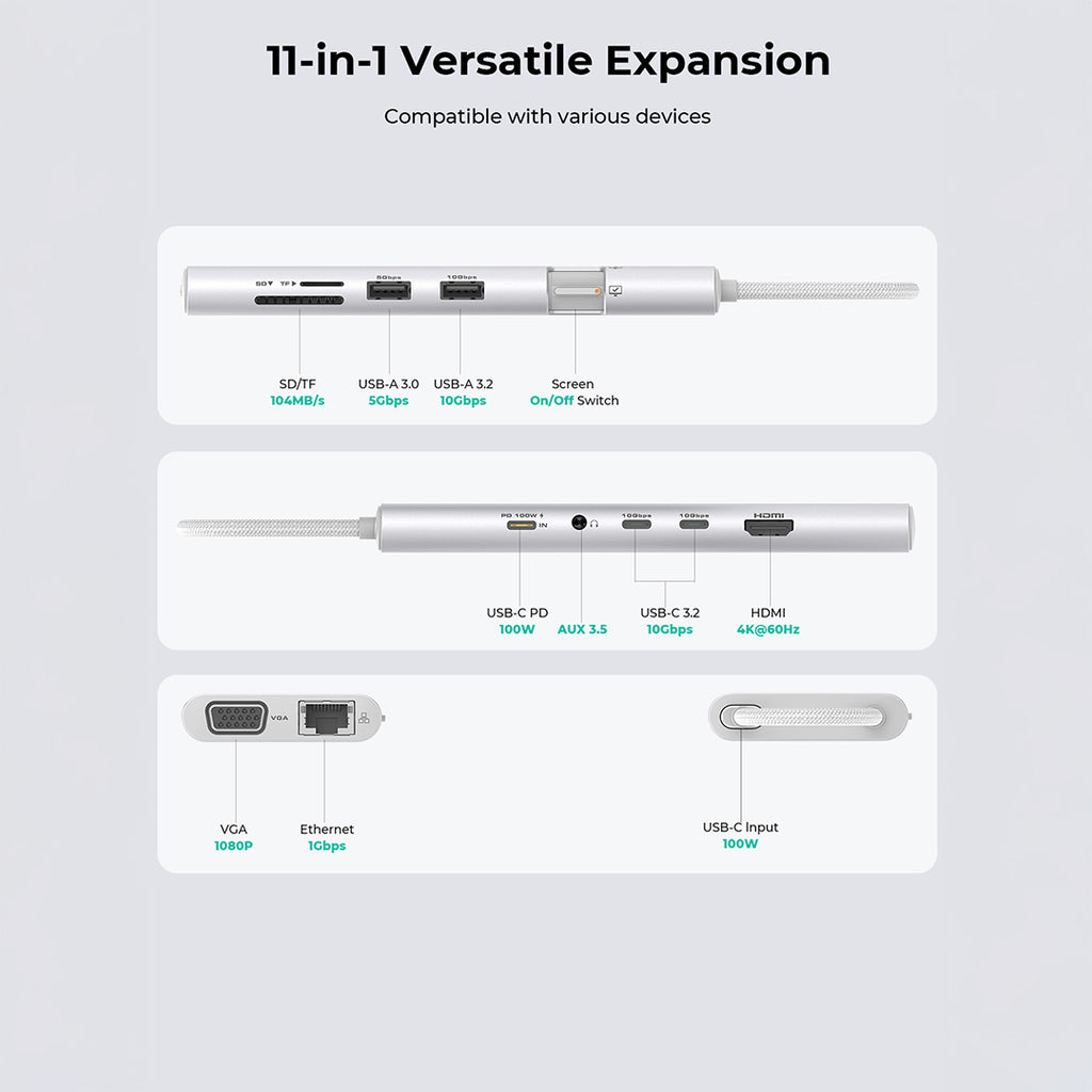 Versatile 11-in-1 Expansion: Equipped with 1 × HDMI, 1 × USB-A, 4 × USB-C, 2 × TF/SD card slots, 1 × VGA, 1 × 3.5mm AUX, and 1 × Ethernet port. This all-in-one hub satisfies diverse expansion needs in the office, boosting productivity and efficiency.